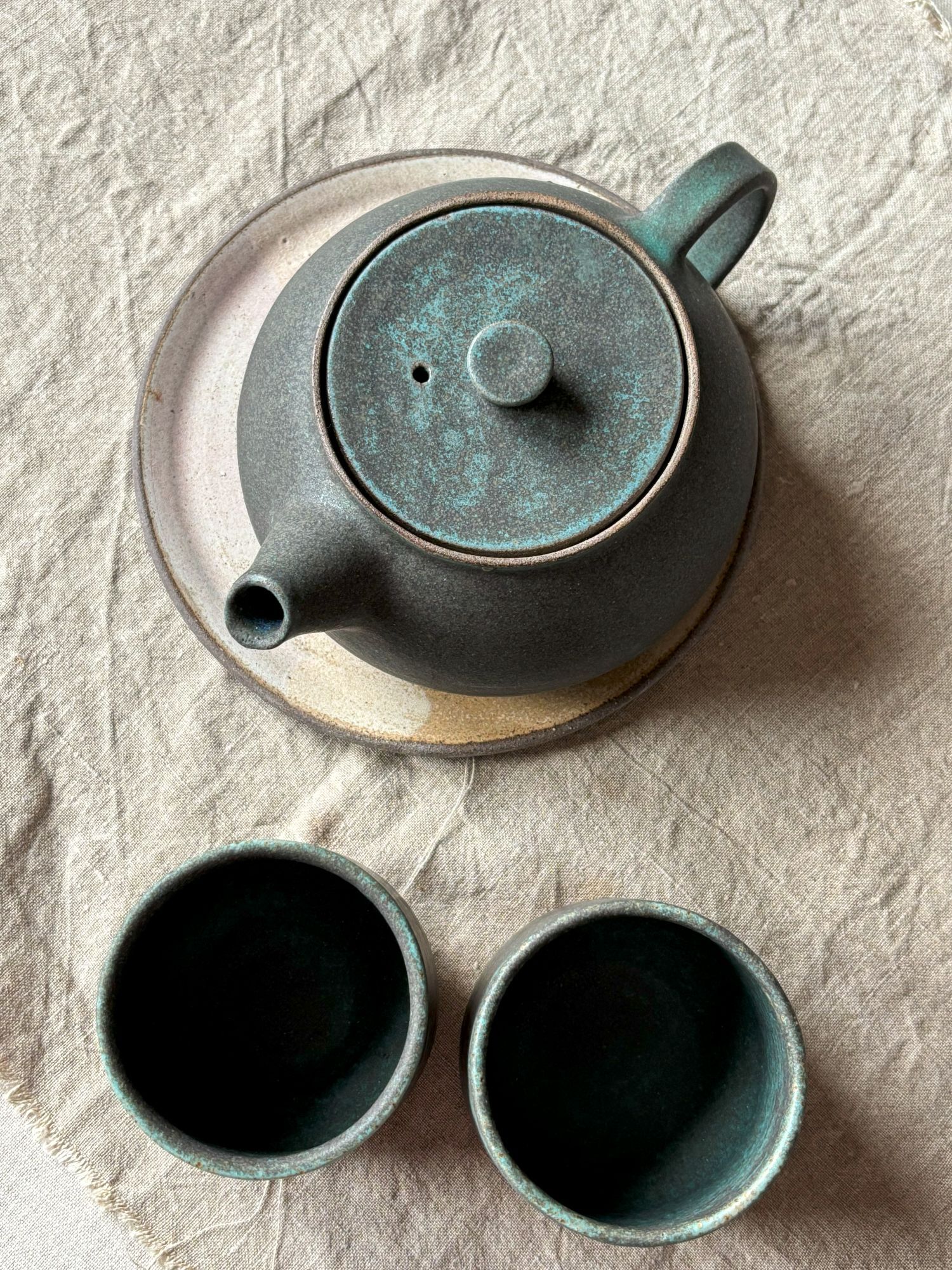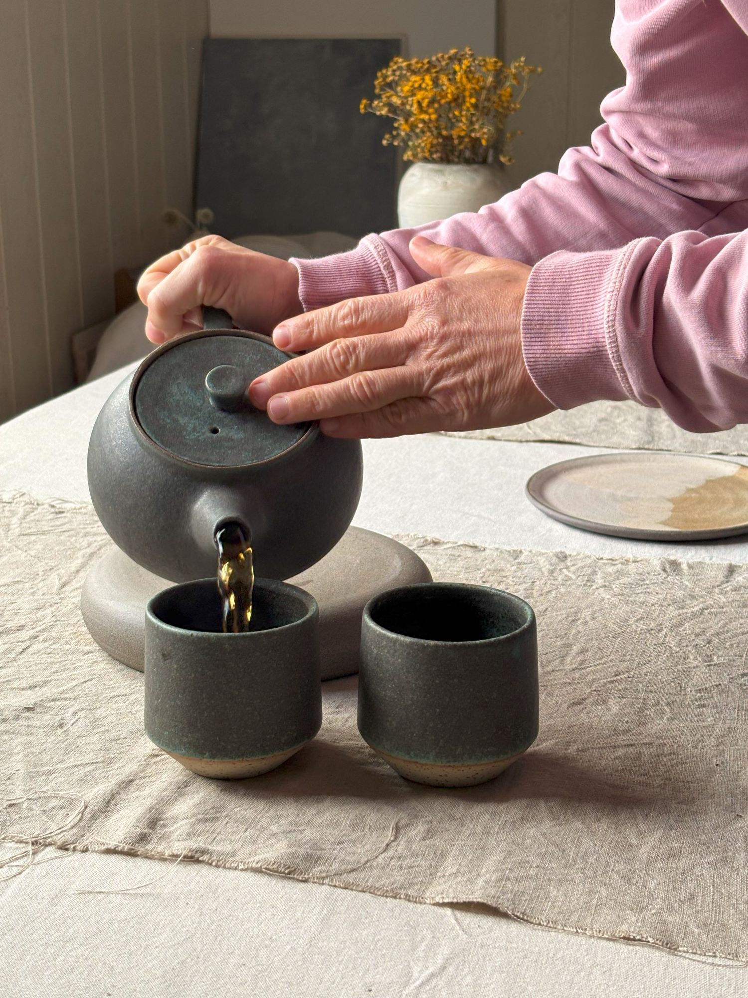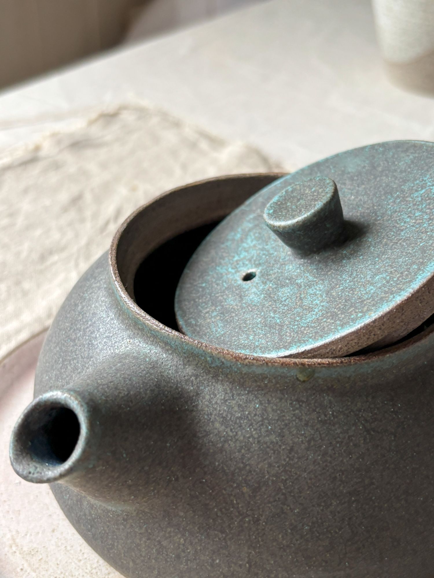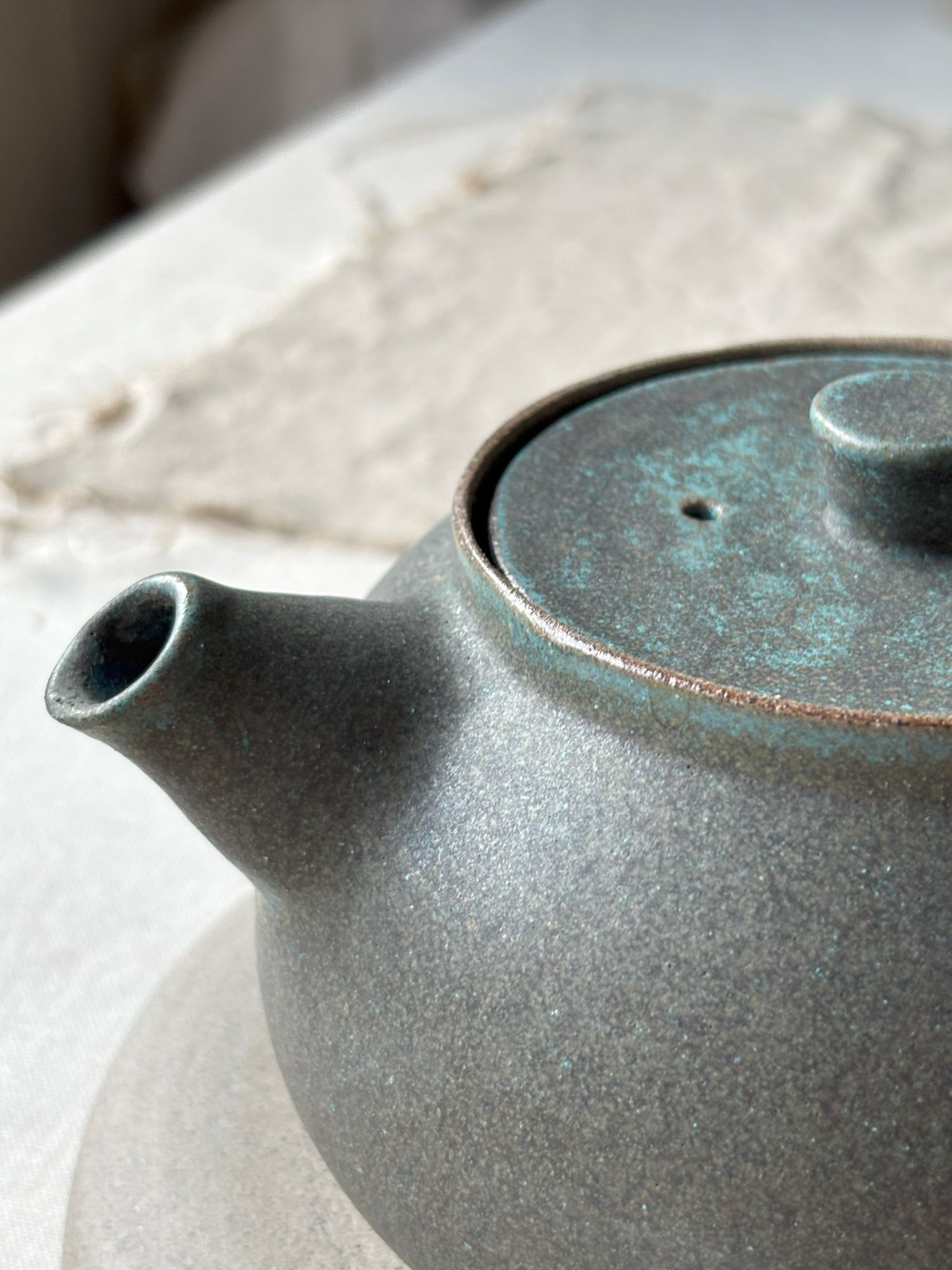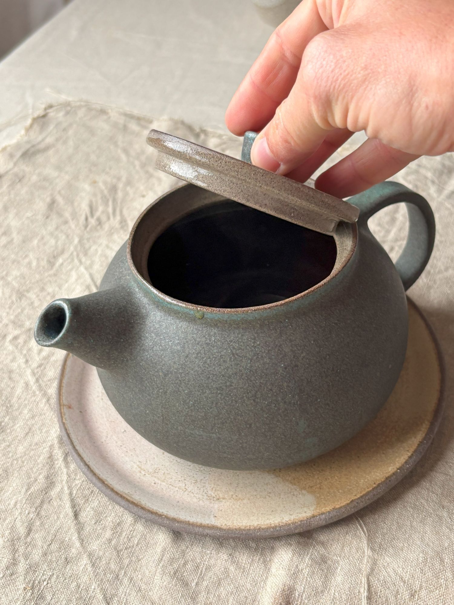 Czajnik do herbaty o klasycznym kształcie. Wykonany na kole garncarskim z szarej kamionki, szkliwiony matowym szkliwem w odcieniach ciemnej zieleni ( kolekcja M e c h ). Dobrze trzyma ciepło i będzie idealny do zaparzenia porcji herbaty na pół dnia w pracy czy też w domu, w weekendowe popołudnie. Jest zaopatrzony w wewnętrzne " sitko" więc można używać również herbaty liściastej.