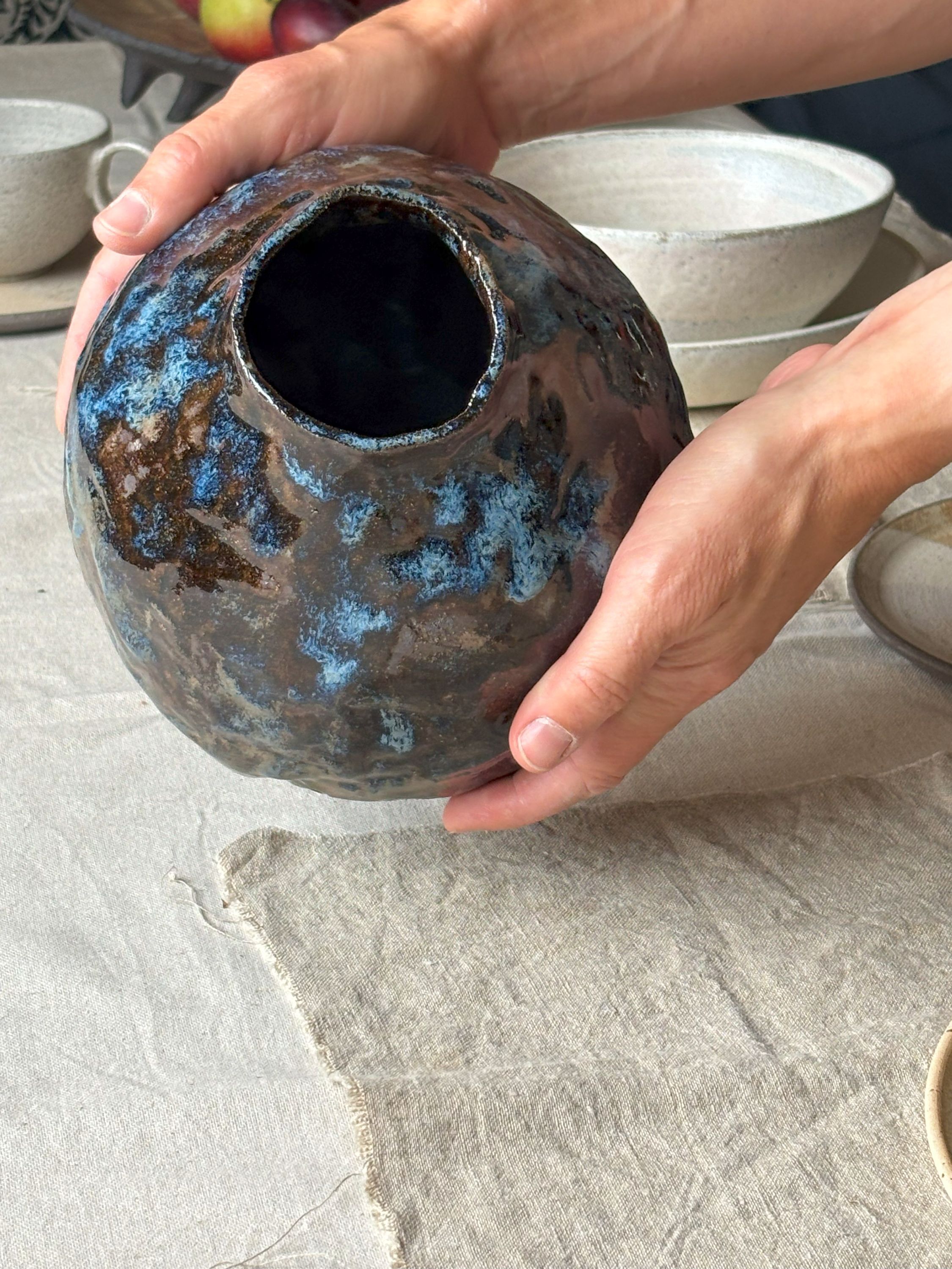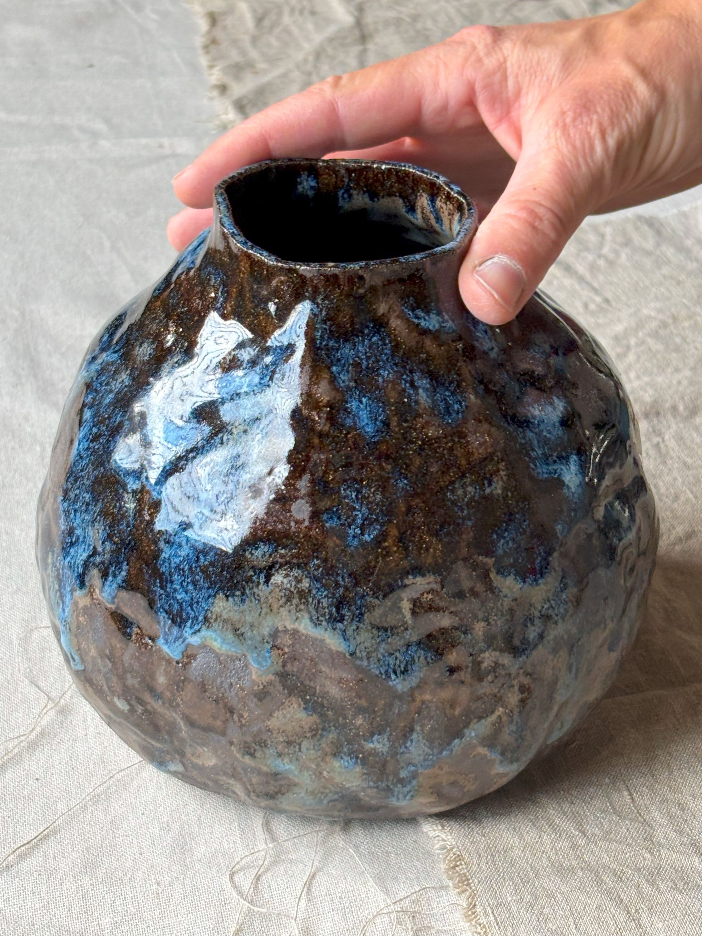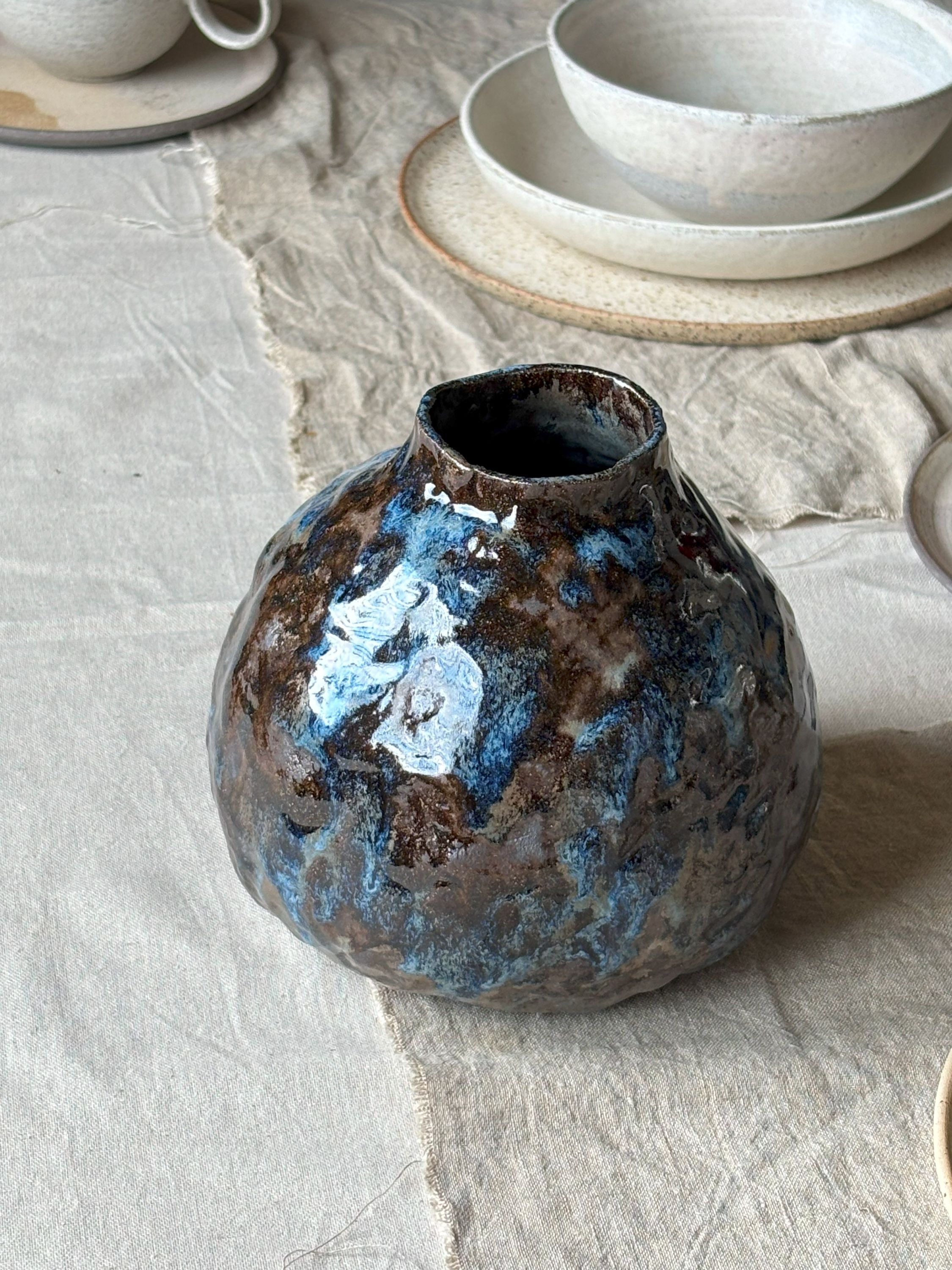 Ciekawy, średniej wielkości wazon sprawdzi się jako samodzielna forma dekoracyjna, lub, oczywiście do wstawienia kwiatów, czy to żywych, czy suszonych. Szkliwiony ręcznie mieszanką szkliw, co daje bardzo malarski efekt.