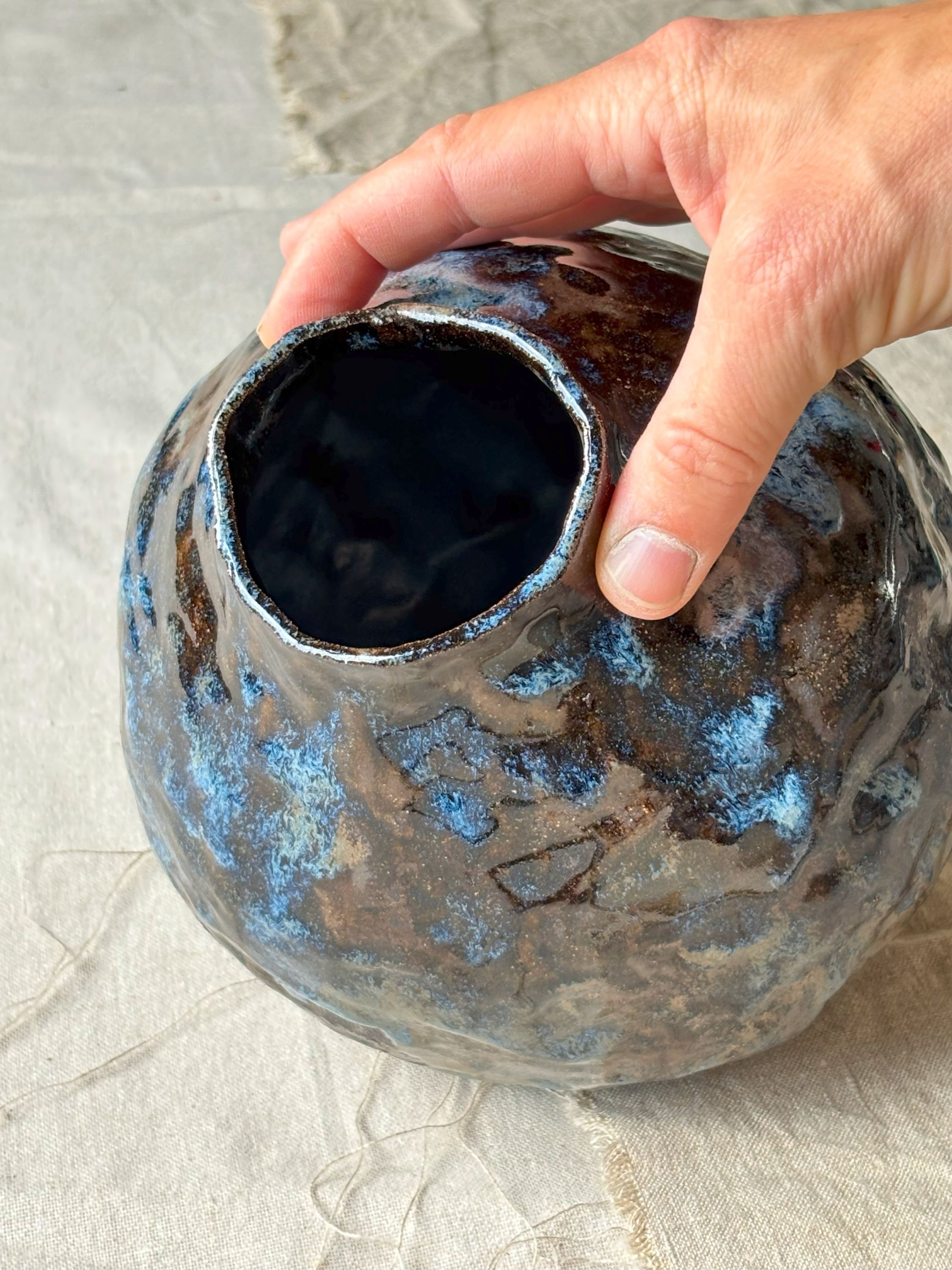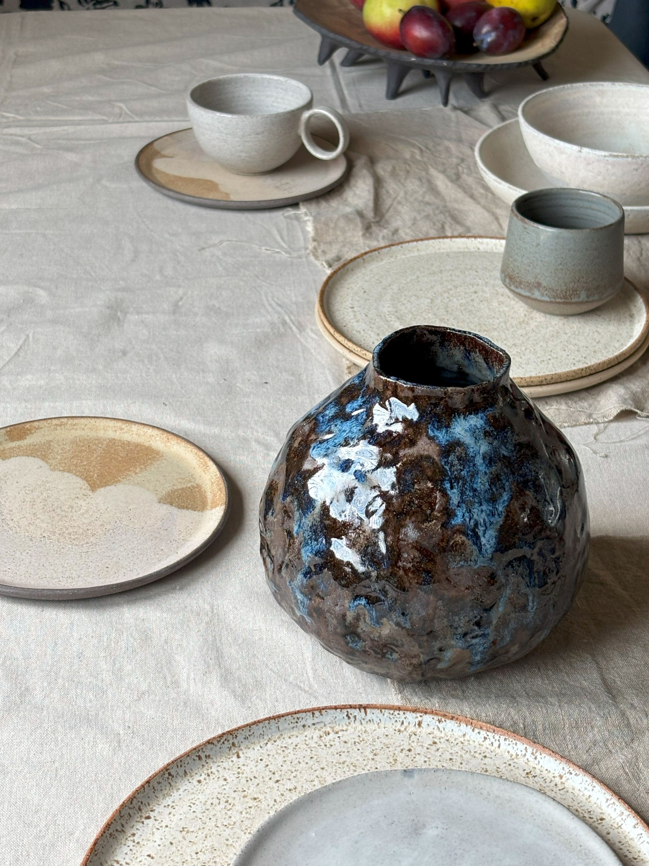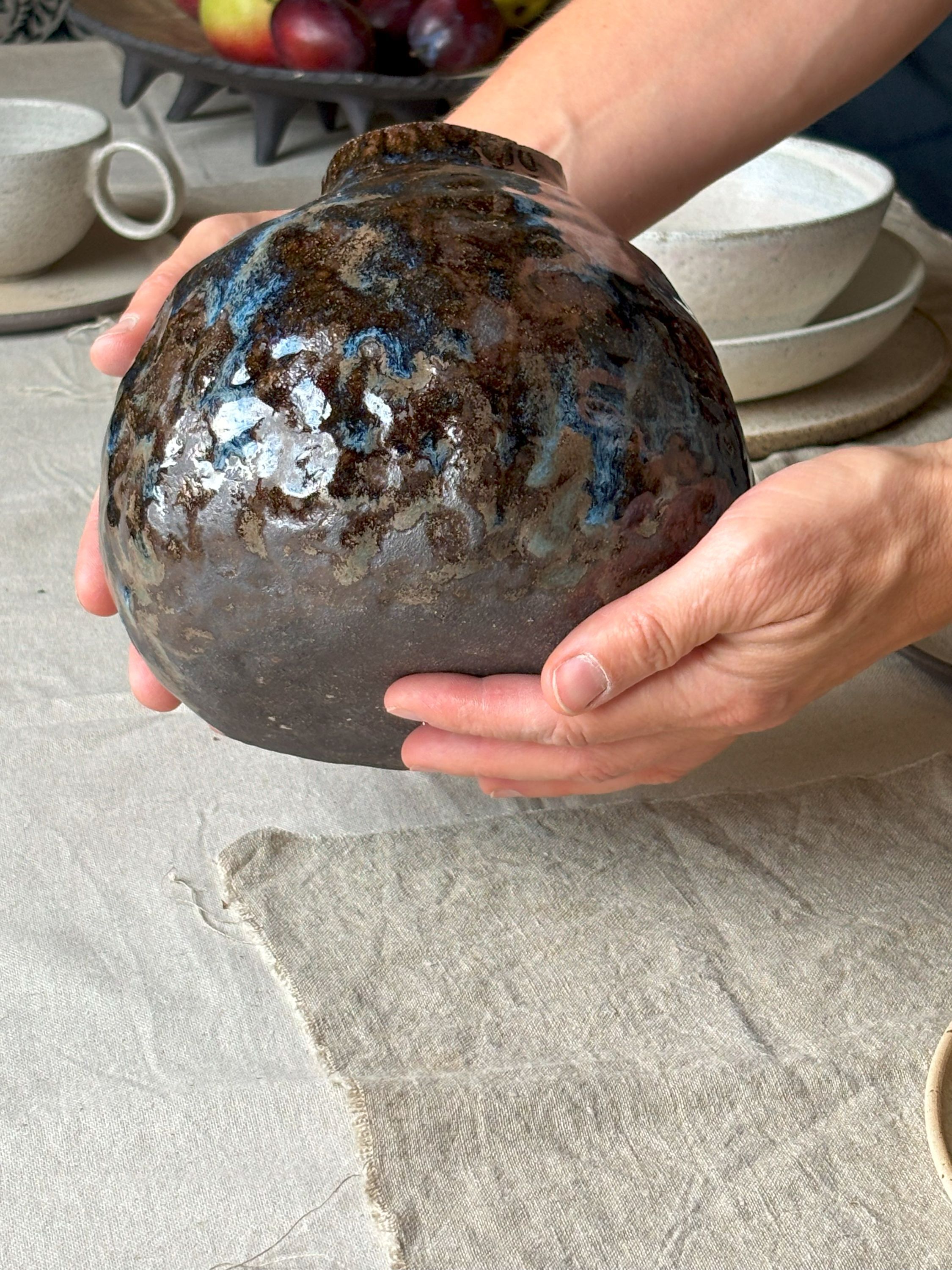 Ciekawy, średniej wielkości wazon sprawdzi się jako samodzielna forma dekoracyjna, lub, oczywiście do wstawienia kwiatów, czy to żywych, czy suszonych. Szkliwiony ręcznie mieszanką szkliw, co daje bardzo malarski efekt.
