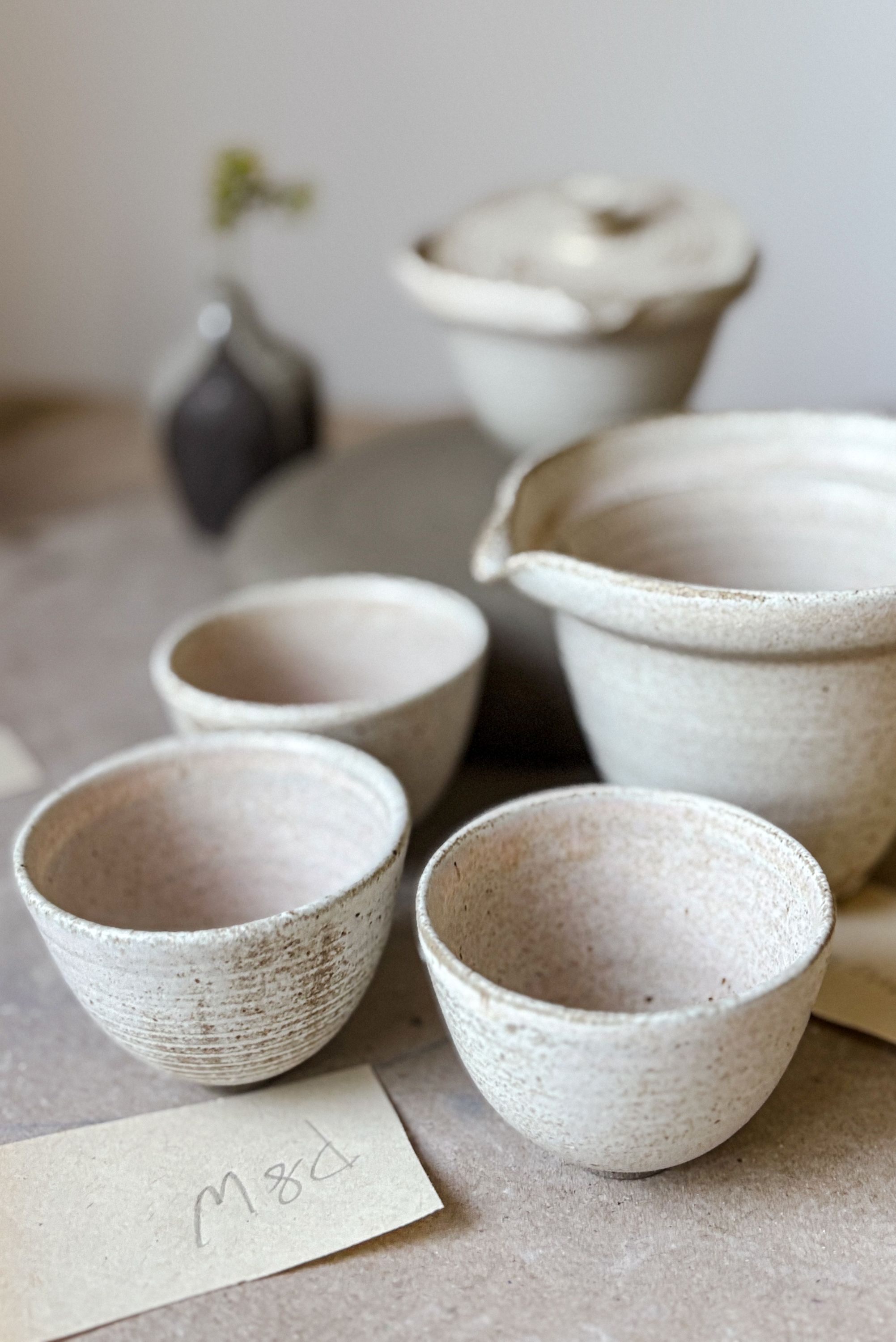 - jasnoobrązowa kamionka, szkliwiona satynowym szkliwem w odcieniach bladego pudrowego różu z brązowymi delikatnymi kropeczkami.